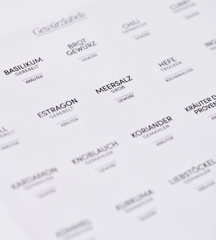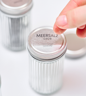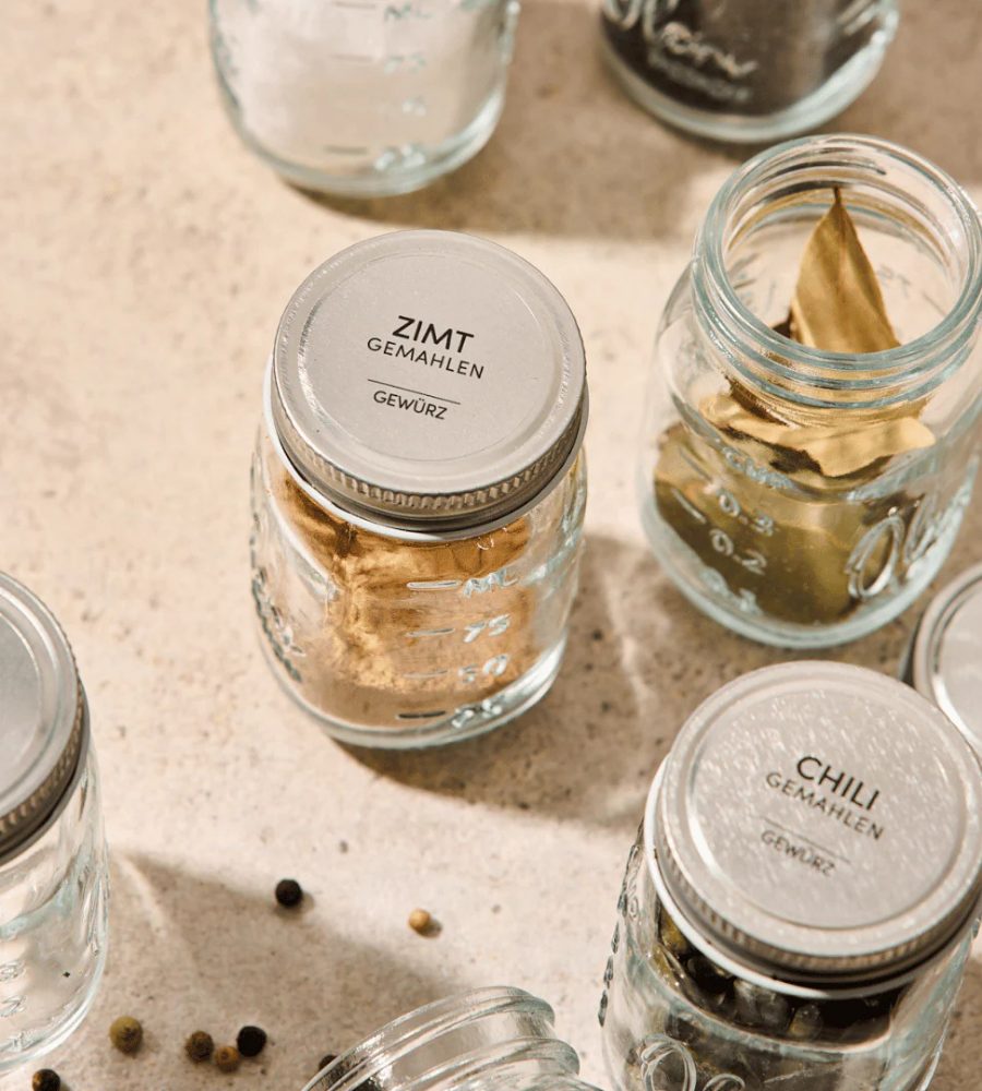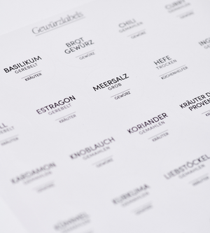 To attach the labels to the square spice jars, first clean the lid with soap. To apply the labels, press the sticker with the inscription onto the lid and smooth it out. Wait 24 hours before washing for the first time.